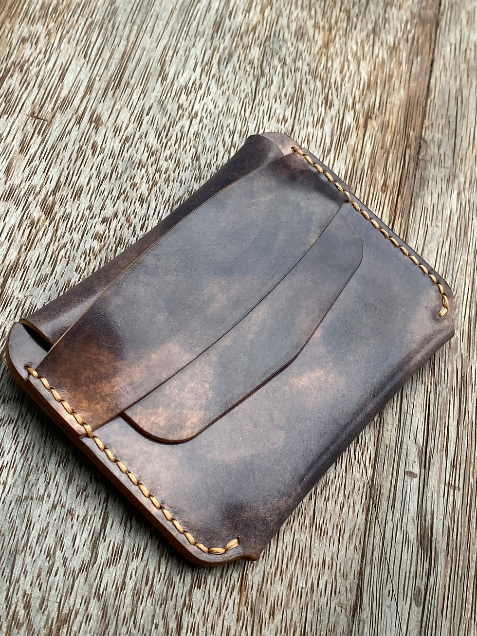 This Dram wallet is saddle stitched with Pea Green Tiger Thread by hand for stength and durability and made in Rocado Shell Cordovan in 3 marbled colours of Black, Brown and Green